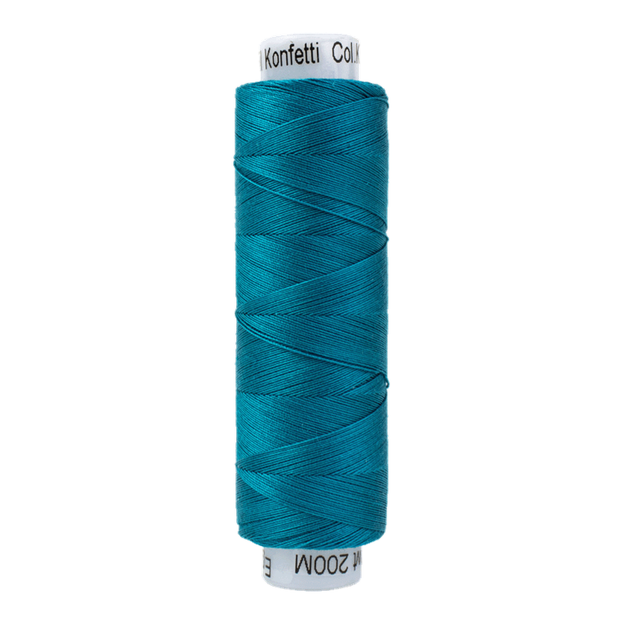 This is the good stuff — Konfetti is a premium 50 wt, 3-ply, 100% long-staple Egyptian cotton thread that’s been double-gassed (burned twice to remove lint) and mercerized for a smooth, soft finish and beautiful sheen. It glides effortlessly through your machine or hand-sewing needle, leaving behind clean stitches and zero fluff.