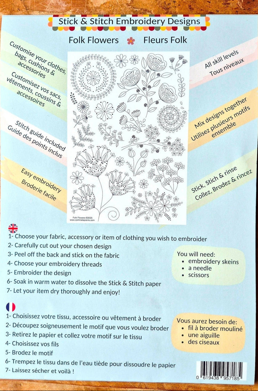 Easy to use self-adhesive water soluble transfer sheets can be used on all washable fabrics to personalize and decorate textiles. Simply cut out the design, peel off the backing, stick onto the fabric or clothing and embroider. Once completed, the pattern can be rinsed away in warm water leaving just a beautiful embroidered creation.